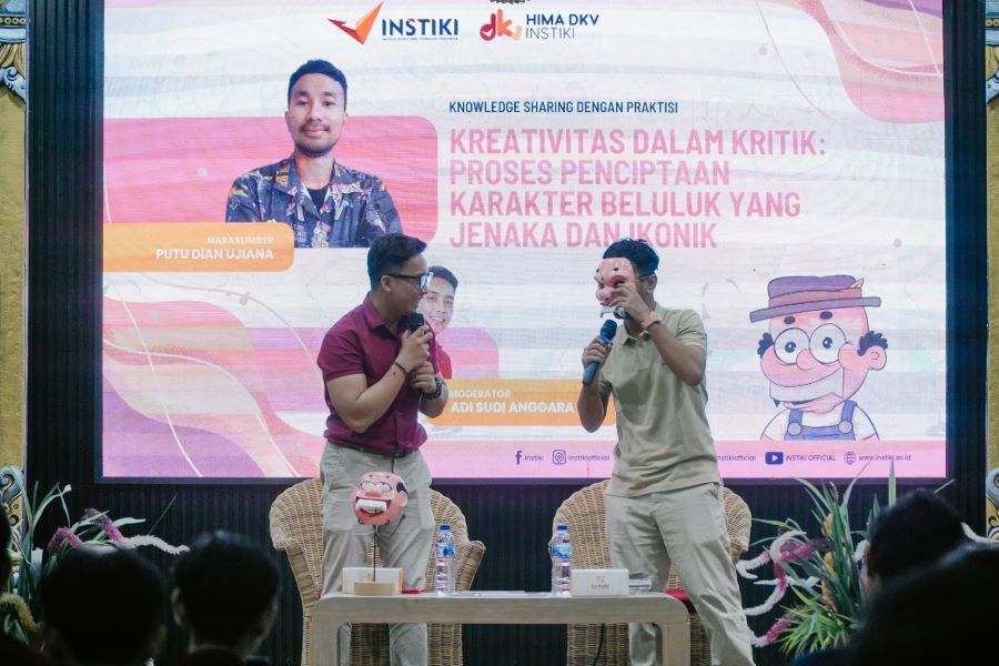 Acara dibuka dengan sambutan dari I Ketut Setiawan, S.Pd., M.Sn., ACP selaku Koordinator Program Studi Desain Komunikasi Visual (DKV) INSTIKI. Acara lalu dilanjutkan dengan pemaparan materi oleh narasumber, Putu Dian Ujiana dengan dipandu oleh I Gede Adi Sudi Anggara, S.Kom., M.Sn yang merupakan Dosen DKV INSTIKI sekaligus Sekretaris Program Studi Desain Komunikasi Visual (DKV) INSTIKI. Pada kesempatan ini narasumber menjelaskan perjalanan kreatif dalam menciptakan karakter “Beluluk,” mulai dari konsep awal hingga eksekusi karya. Putu Dian Ujiana menguraikan bagaimana ia menggabungkan humor, kritik sosial, dan elemen budaya Bali dalam karya tersebut. Karakter “Beluluk” tidak hanya menjadi ikon jenaka, tetapi juga sarana untuk menyampaikan pesan-pesan sosial secara kreatif. Dalam sesi ini, mahasiswa turut diajak untuk aktif berdiskusi dan bertanya, menjadikan acara lebih interaktif dan menarik.