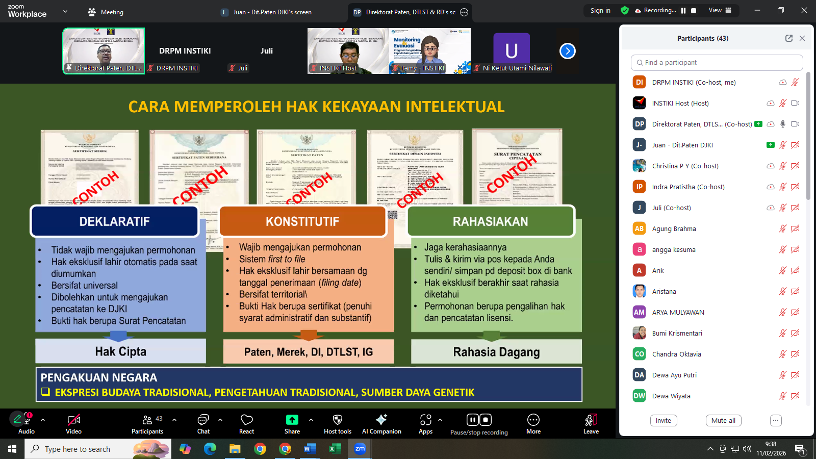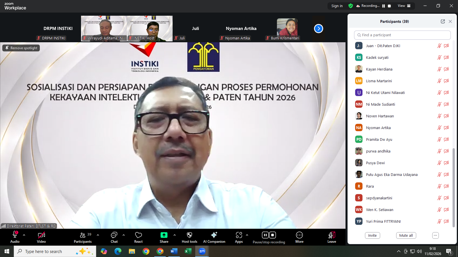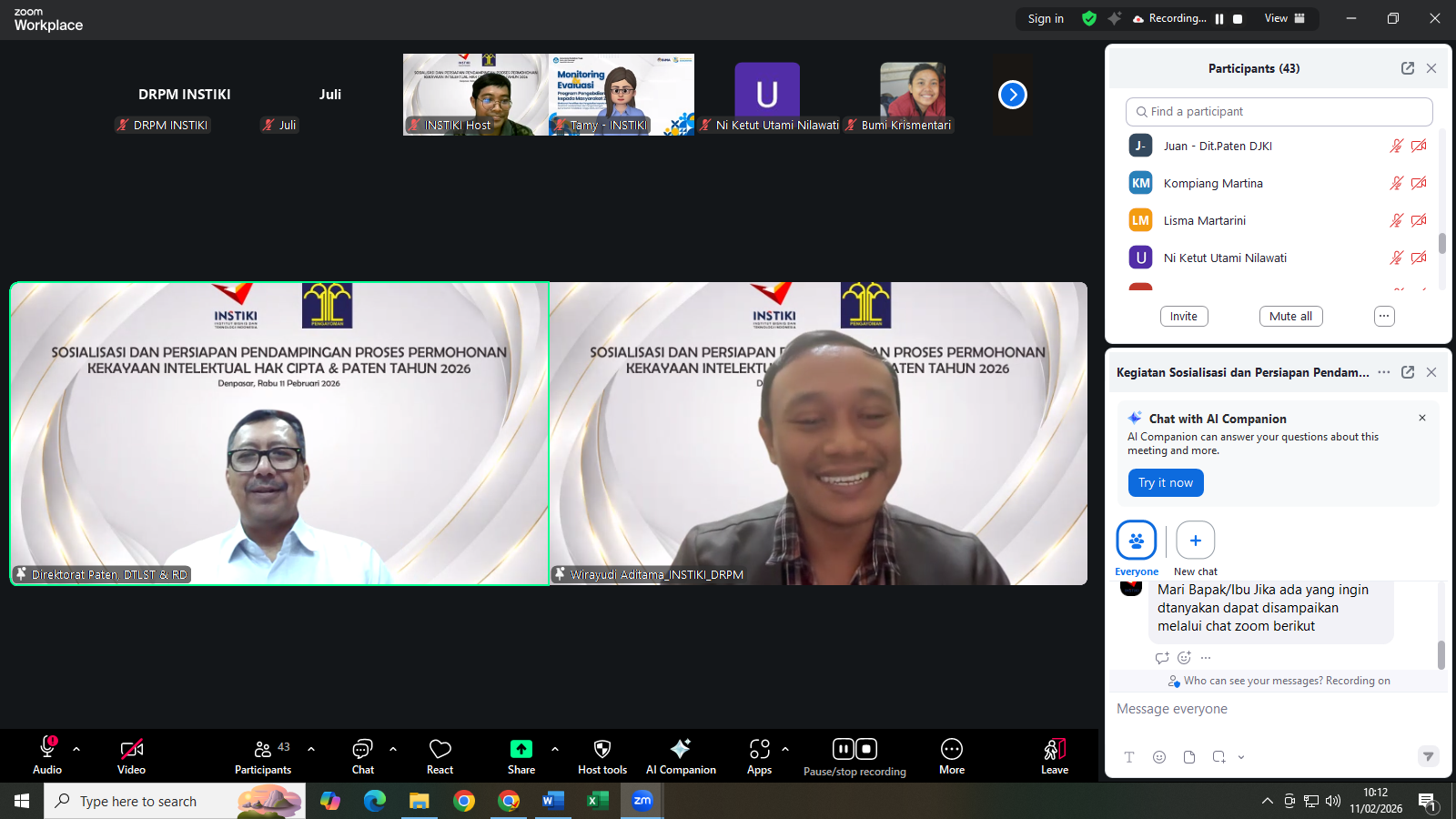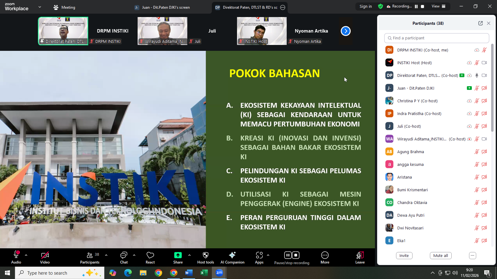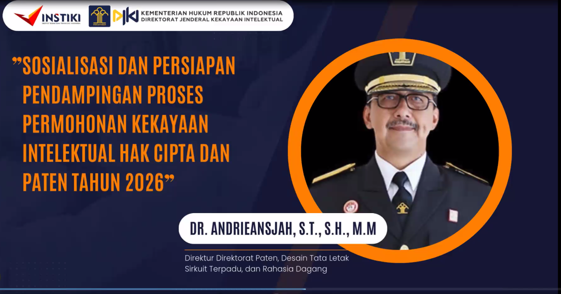 Institut Bisnis dan Teknologi Indonesia (INSTIKI) melalui Direktorat Riset, Pengabdian Masyarakat, dan Inovasi (DRPM) menyelenggarakan kegiatan “Sosialisasi dan Persiapan Pendampingan Proses Permohonan Kekayaan Intelektual Hak Cipta & Paten Tahun 2026” pada Rabu, 11 Februari 2026 secara daring melalui Zoom Meeting. Kegiatan ini bertujuan meningkatkan pemahaman dosen mengenai tata cara pengajuan HKI dan paten sekaligus menumbuhkan kesadaran akan pentingnya perlindungan kekayaan intelektual guna mendorong peningkatan jumlah pengajuan HKI di lingkungan sivitas akademika.