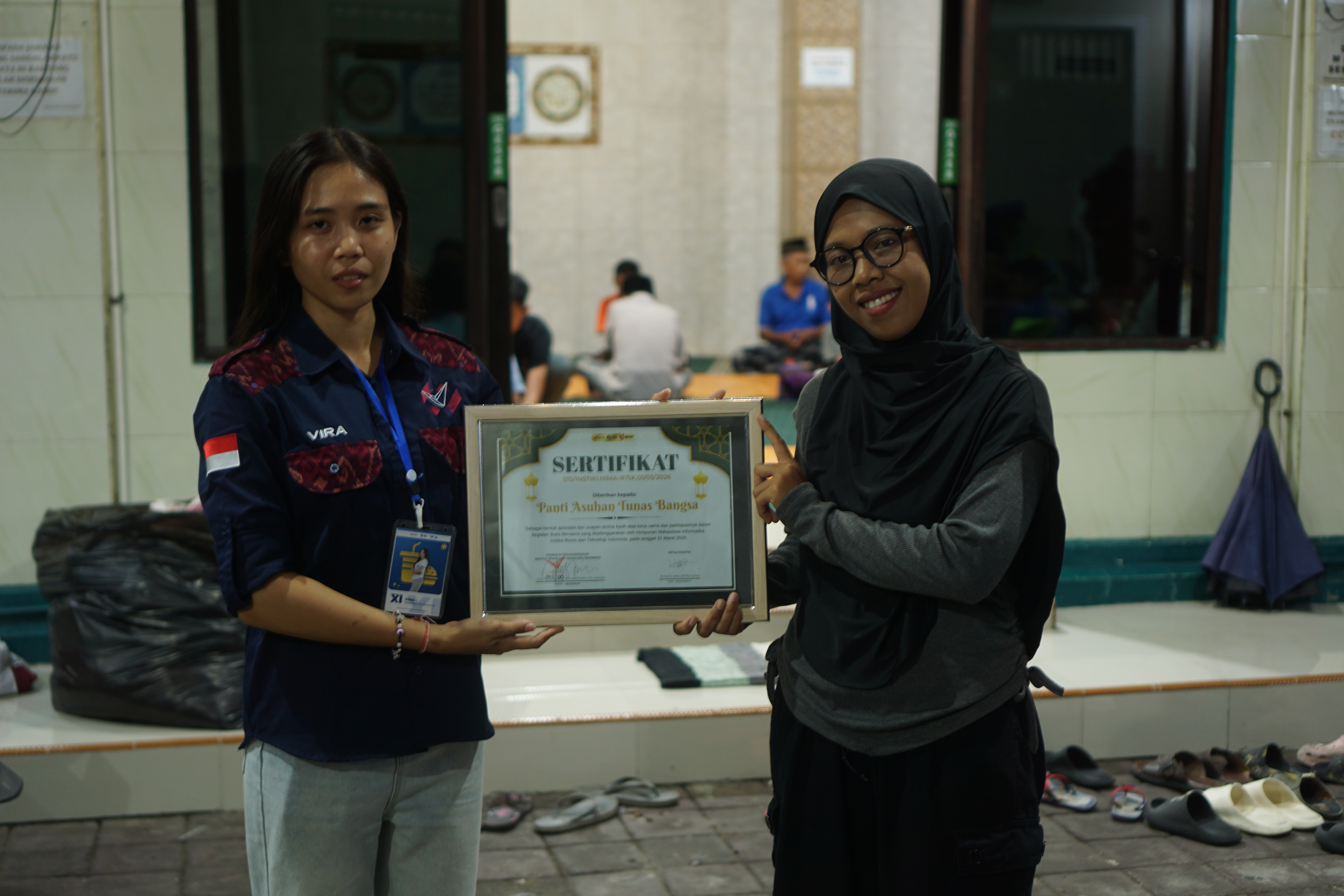 Sebagai bentuk apresiasi, panitia juga menyerahkan sertifikat dan mengabadikan momen melalui sesi foto bersama. Kegiatan kemudian ditutup dengan pembersihan area serta penutupan acara secara resmi.Kegiatan yang diikuti oleh 20 orang panitia ini berlangsung selama kurang lebih 4 jam 35 menit, mulai pukul 15.00 hingga 19.35 WITA. Seluruh rangkaian acara berjalan dengan lancar dan meninggalkan kesan mendalam, baik bagi mahasiswa maupun anak-anak panti.